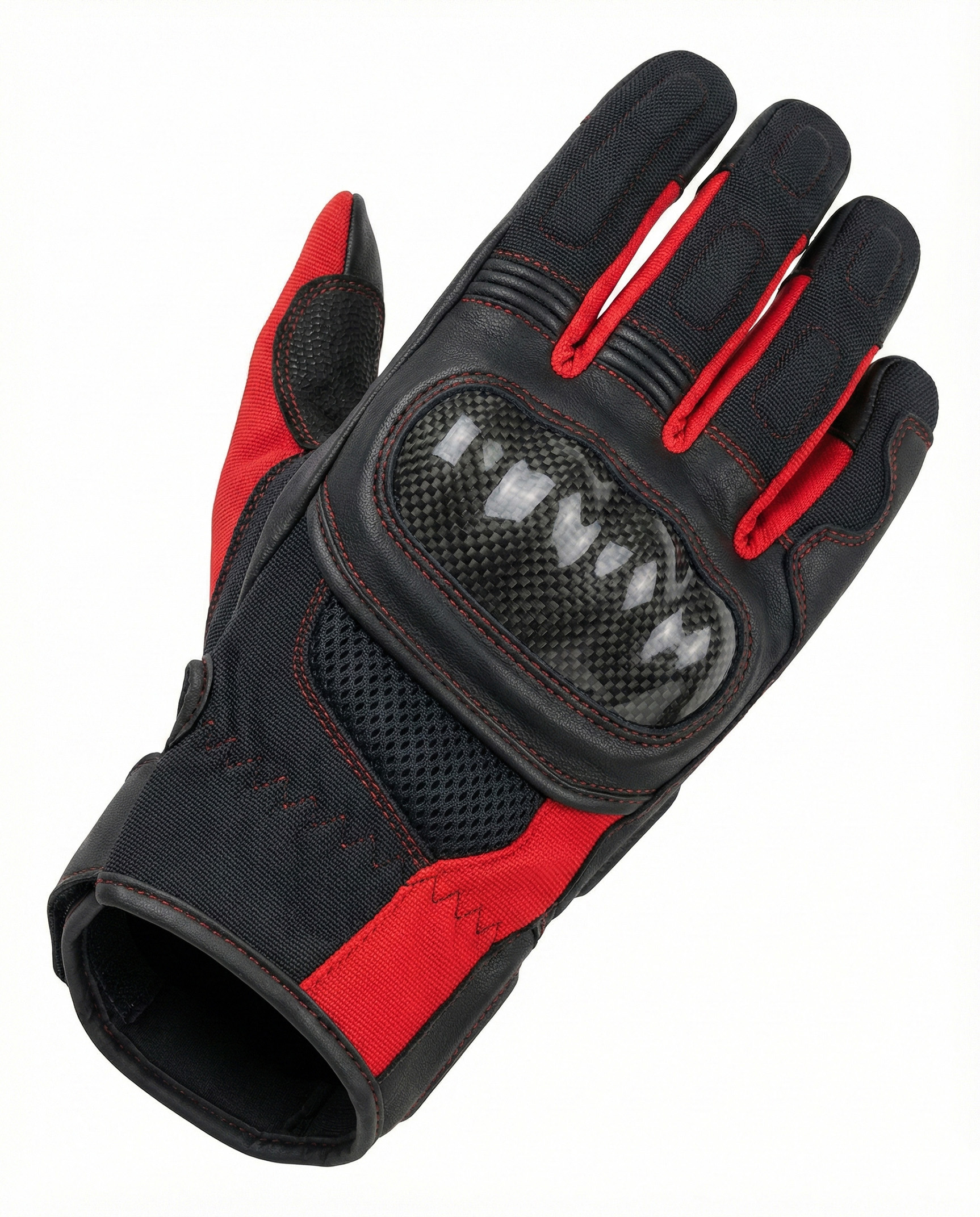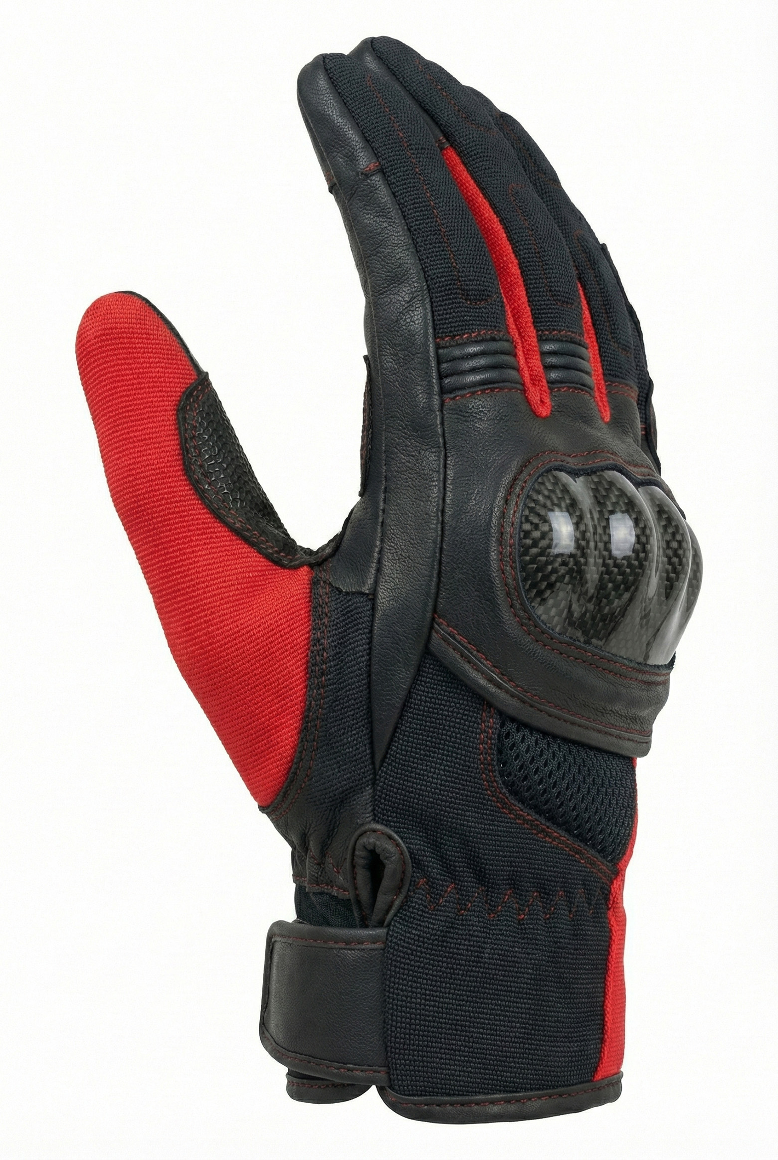 Master the streets with the MG-100 Carbon-Vent Series. Designed for the rider who demands aggressive styling without sacrificing hot-weather comfort, this glove features a tactical hybrid construction of premium goatskin leather and high-airflow 3D mesh. The centerpiece is a high-gloss, genuine carbon-fiber knuckle shield that provides elite impact dissipation. With its striking red-on-black aesthetic, the MG-100 is the perfect balance of lightweight agility and heavy-duty protection.
